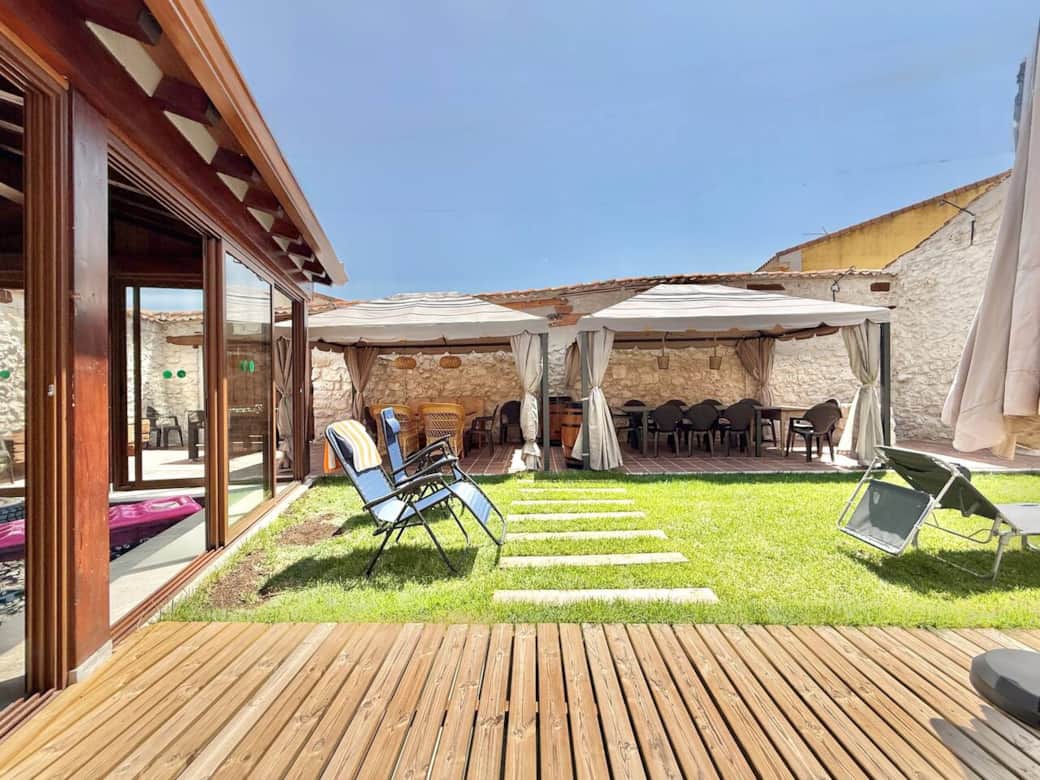 Patio amplio y luminoso con césped, barbacoa y zona chill-out bajo carpa. Dispone de mesa grande para comidas al aire libre, sofás, columpio y futbolín, perfecto para compartir y relajarse en grupo.