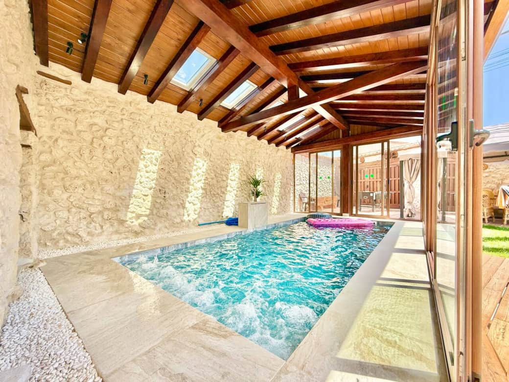 Piscina cubierta y climatizada, rodeada de paredes de piedra y techos de madera. Con grandes ventanales al patio, permite disfrutar del baño en cualquier época del año en un entorno único.