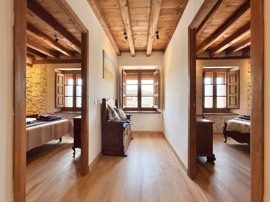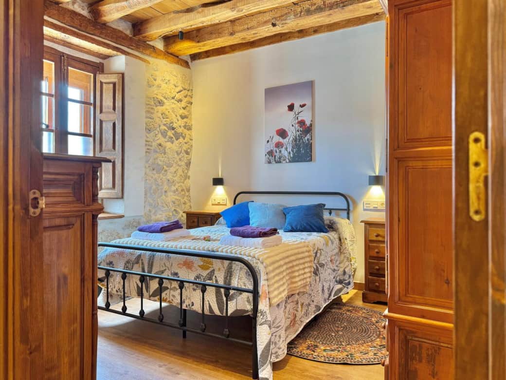 Dormitorio con cama de matrimonio, paredes de piedra y techo de madera que aportan calidez. Un espacio luminoso y confortable, ideal para relajarse tras un día de descanso o actividades en la zona.